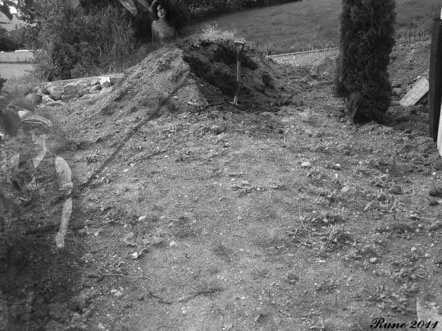 Hun knelte, og jeg kom henne ganske nær, men kunne ikke røre ved henne, og da jeg knelte ved siden av henne så jeg og over på en lav avlang, oppspadd jordhaug.