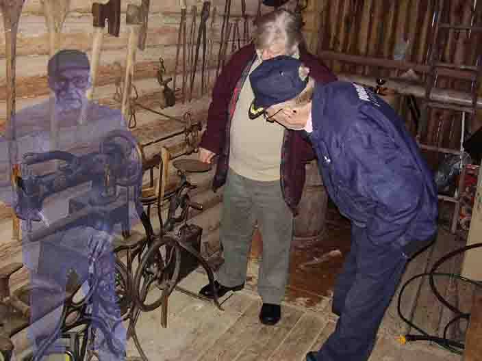 gamlefar (t.v) er tilstede og passer på de gamle ting  han samlet på, men ER BLITT USYNLIG  for andre, slik han tolker det  - for HAN SKJØNNER først  IKKE HVORFOR HAN IKKE LENGER FÅR KONTAKT MED "SLEKTA" - MEN han forstår gradvis at han er død, og når han begynner å åpne seg for hjelp, kan han ledes vekk til det naturlige stedet for "de døde" - hvilket er på et annet livsplan. (bildet er ikke fra boken som denne art. omtaler, men mix laget av RUNE Ø)