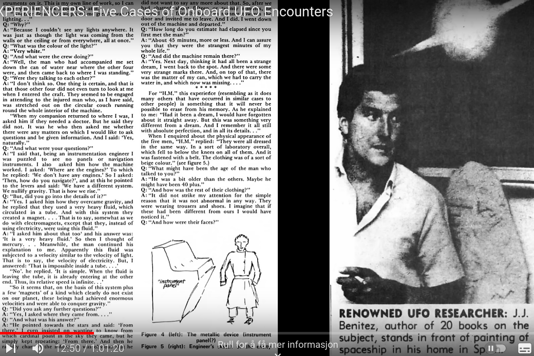 - I mellemtiden fortsatte manden sin forklaring. Tilsyneladende blev dette stof udsat for hastigheder, der var lig med lysets hastighed. Det vil sige en elektrisk strøms hastighed. Men jeg svarede: ,, Det er umuligt inde i et rør." ,,Nej," svarede han. ,,Det er simpelt. Når det flydende stof forlader røret, kommer det allerede tilbage i den anden ende igen. På den måde er dets relative hastighed uendelig..." - Så det lader til, at disse væsener på basis af dette system plus nogle få ,,magneter" af en slags, der ikke findes på vor klode, har opnået enorme hastigheder, der gør dem i stand til at overvinde tyngdekraften.